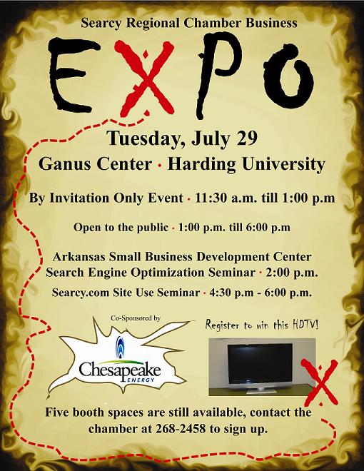 The Searcy Regional Chamber of Commerce will be hosting the eighth annual Business EXPO on July 29th. X definitely marks the spot to be with this year’s treasure hunt theme that will include one lucky winner going home with a 40” Flat screen HDTV! The EXPO is co-sponsored by Chesapeake Energy and will be open to the public from 1:00 p.m. – 6:00 p.m. at the Ganus Center on the Campus of Harding University. The EXPO will feature an array of businesses from restaurants to gas exploration services. So, come find what you’ve been seeking at the Business EXPO 2008. KFFB 106.1 FM WILL BE BROADCASTING 1P TO 5:30 P