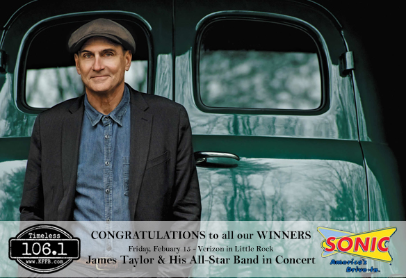 Timeless 106.1 KFFB and Sonic would like to congratulate all the winners that will get to see James Taylor & His All-star Band with Special Guest Bonnie Raitt to Little Rock this Friday night February 15th, Each winner received two tickets to the concert: in Bald Knob- Ron Copeland, Batesville Harrison Street – Tammy Pearce, Batesville St. Louis Street – Robert Mitchum, Southside Independence County- Melinda Sharp, Cabot Bill Foster Memorial Highway- Jeremy Hicks, Greystone – Joanne Spencer, Cave City- Tonya Kissee, Heber Springs – Blake Cole, Melbourne – Missy Kimble, Quitman – Tammy Stair and in Searcy on Race Street – Tom Webb, Searcy on Beebe Capps – David Merritt, and in Searcy on Maple Street – Charletta Pruitt, in Perryville- Tabitha Resecker and the Timeless 106.1 KFFB Facebook winner Is Myrl Lawrence from Cabot. Plus each winner won a $50.00 Sonic Gift Card at Each Location. Congratulations to all our winners to see James Taylor & His All-Star Band with special guest Bonnie Raitt to Little Rock this Friday night February 15th with Sonic and Timeless 106.1 KFFB.