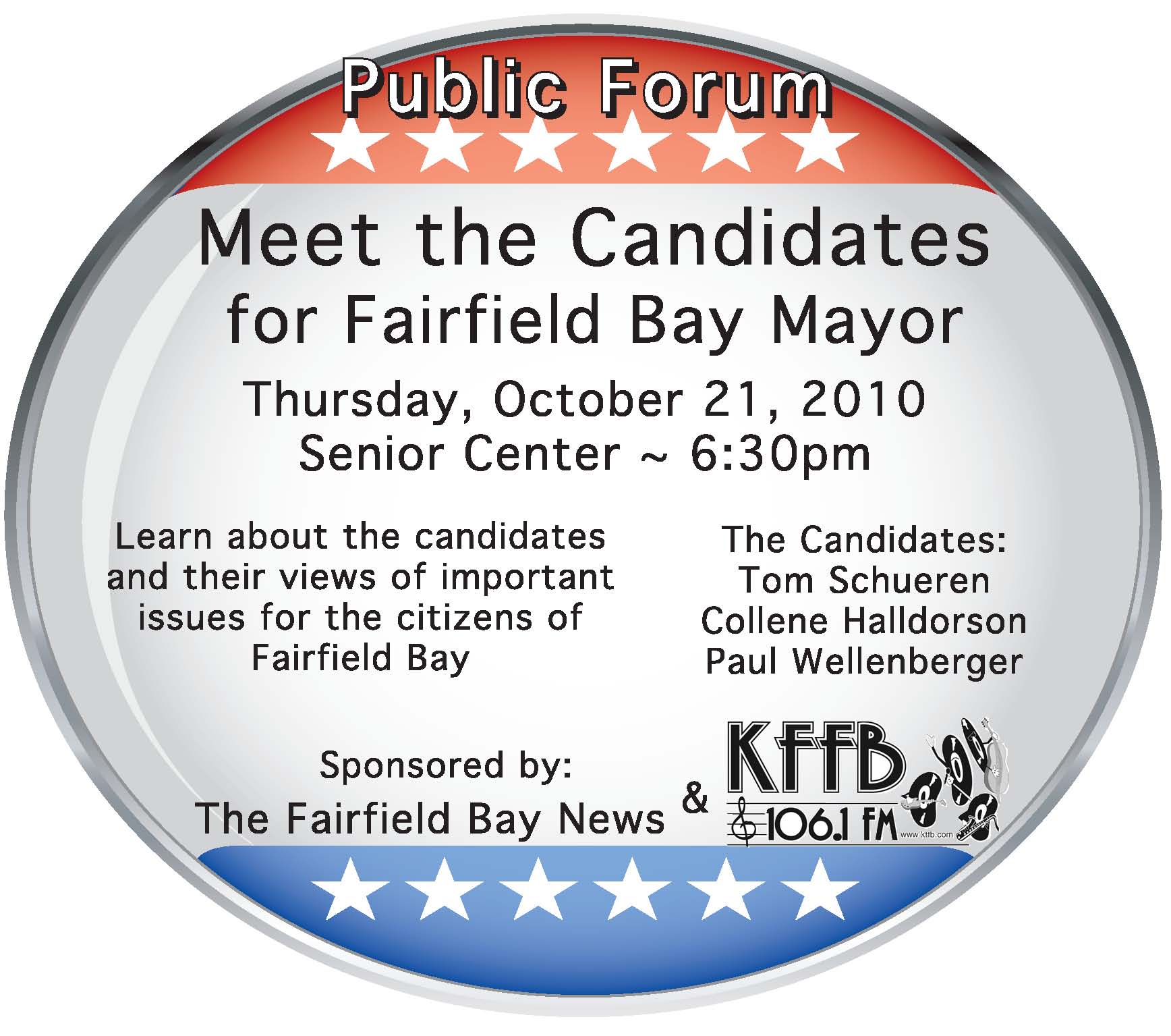 KFFB and the Fairfield Bay News will sponsor a forum for the Fairfield Bay mayorial candidates at 6:30 on October 21st. It will held at the Senior Center in Fairfield Bay.