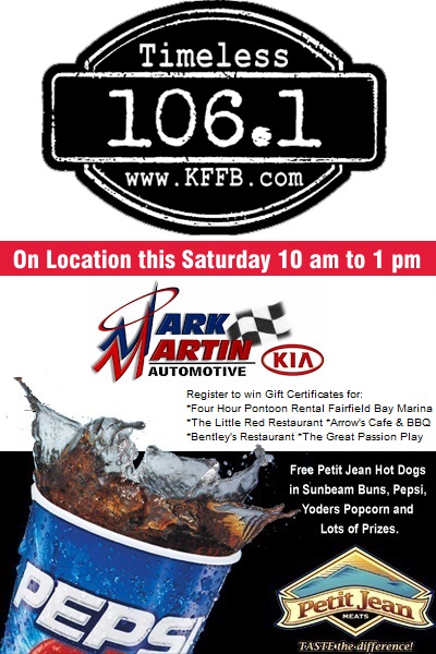 Plus, we will be serving up Free Petit Jean Hot Dogs, wrapped in a Sunbeam Bun, Pepsi, and Mountain Tyme Mercantile Popcorn. Drop by for details on how you can win $106.10 with Timeless 106.1 KFFB!