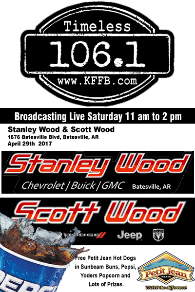 Join the Timeless 106.1 KFFB Road Gang this Saturday at Stanley Wood Chevrolet-Buick-GMC and Scott Wood Chrysler, Dodge and Jeep, Highway 167 South of Batesville for their Customer Appreciation Day. Come enjoy free Petit Jean Hot Dogs wrapped in a Sunbeam Bun, and free Pepsi. See you Saturday from 11 a.m. till 2 p.m. at Stanley Wood and Scott Wood!