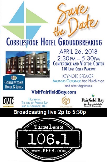 Join Timeless 106.1 KFFB at Cobblestone Groundbreaking in Fairfield Bay Thursday, April 26, 2018.