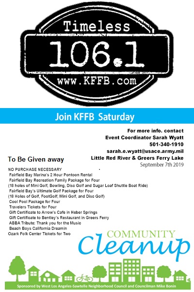 JOIN TIMELESS 106.1 KFFB Saturday, August 7th at the Greers Ferry Lake and LittleRed River Clean-Up in Greers Ferry from 11 am to 1 pm. The U.S. Army Corps of Engineers and Greers Ferry Lake & Little Red River Association will host their GreersFerry Lake & Little Red River Cleanup. Volunteers are needed to help pick up litter by land and boat along Greers Ferry Lake and the Little Red River shoreline. For more information, please contact Event Coordinator Sarah Wyatt at 501-340-1910 or sarah.e.wyatt@usace.army.