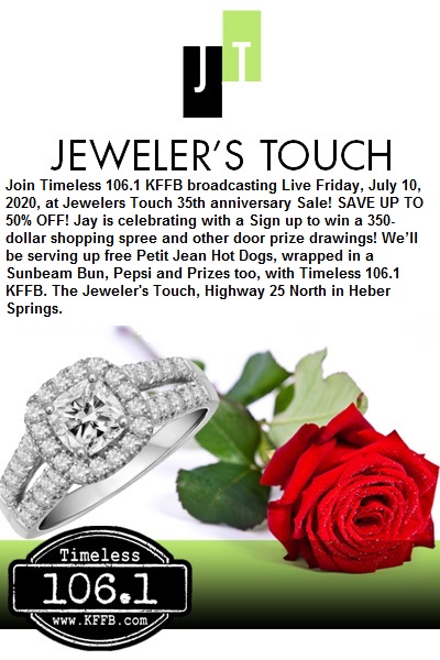 Join Timeless 106.1 KFFB broadcasting Live Friday, July 10, 2020, at Jewelers Touch 35th anniversary Sale! SAVE UP TO 50% OFF! Jay is celebrating with a Sign up to win a 350-dollar shopping spree and other door prize drawings!
