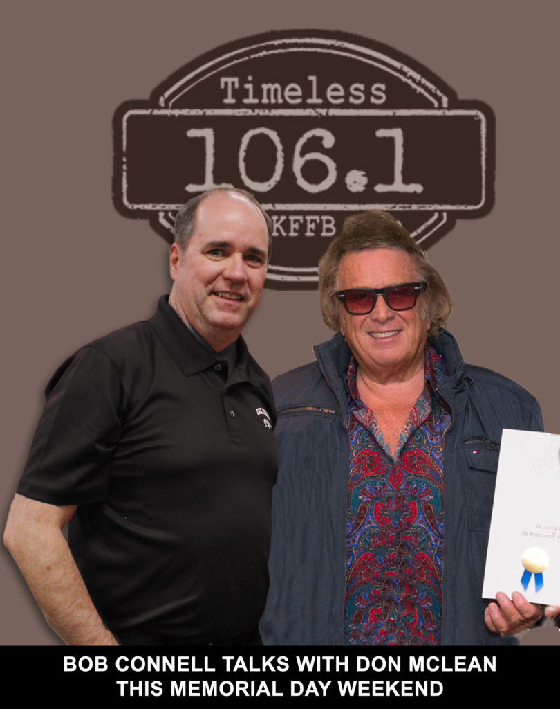 Join Timeless 106.1 KFFB’s Bob Connell from the Stanley Wood Chevrolet studios this Memorial Day Weekend, as he Welcomes Timeless Music Icon, Don Mclean who penned, “American Pie”, “Vincent”, a rendition of Roy Orbison’s “Crying”, and a rendition of the Skyliners’ “Since I Don’t Have You”, Enjoy interviews and hit songs with interview updates throughout the Memorial Day Weekend from Don Mclean all weekend, with Timeless 106.1 KFFB.