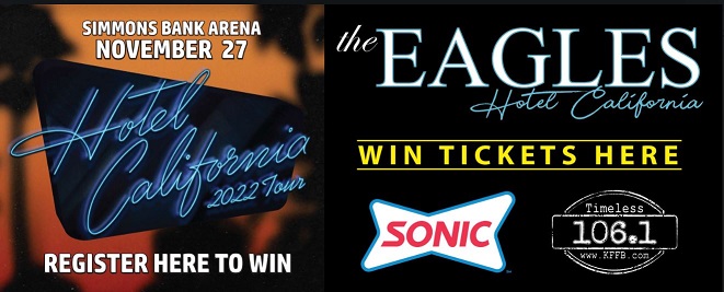 Then join us for the final day will be broadcasting from Sonic in Quitman from 9:00 to noon and Sonic in Heber Springs from 2:00 to 5:30 with the grand prize of a pair of Eagle concert tickets to be giving away at 5:30pm on Wednesday. Good luck to you from all of us at Sonic and Timeless 106.1 KFFB.