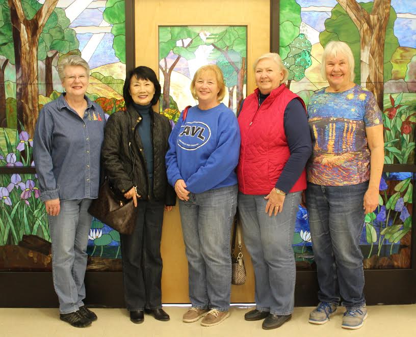 Several of the local artists hanging their work at Ozark Health Medical Center are (from left) Joyce Hubbard, Yun Kim, of Mountain View; Julie Caswell, Jan Cobb, of Edgemont; and Joyce Hartmann, Choctaw.