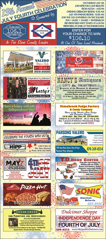 Mountain View’s 13th Annual Fourth of July Celebration with Timeless 106.1 KFFB and the Stone Count Leader, Register at all participating sponsors to increase your chances for $106.10 to be given away at 4 pm on July 4th!