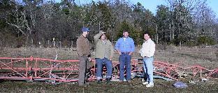 (Left to Right) Bob Connell Owner of KFFB, Jack Oyler Engineer for KFFB, Wesley Wallace of Wallace Tower Service, and Matt Monin Engineer for KFFB, look over the tower that fell in the 2009 ice storm.