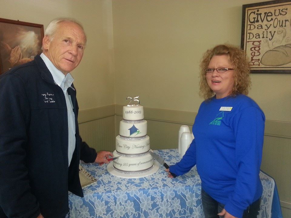 Gary Farmer snd Lavinia Turner cut the the 25th anniversary celebration cake. Gary and Lavinia have been part of the nursing home since the beginning.