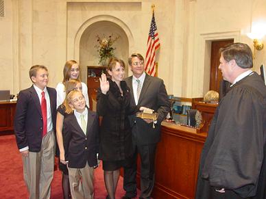 (Above) Senator Missy Irvin is sworn in to the Arkansas Senate by Chief Justice Jim Hannah of the state Supreme Court. With her is her husband, Dr. Dawson Irvin, M.D., and her children Hennelly (left), Allyn (the tallest), Josie (partially hidden) and Ike (in front).