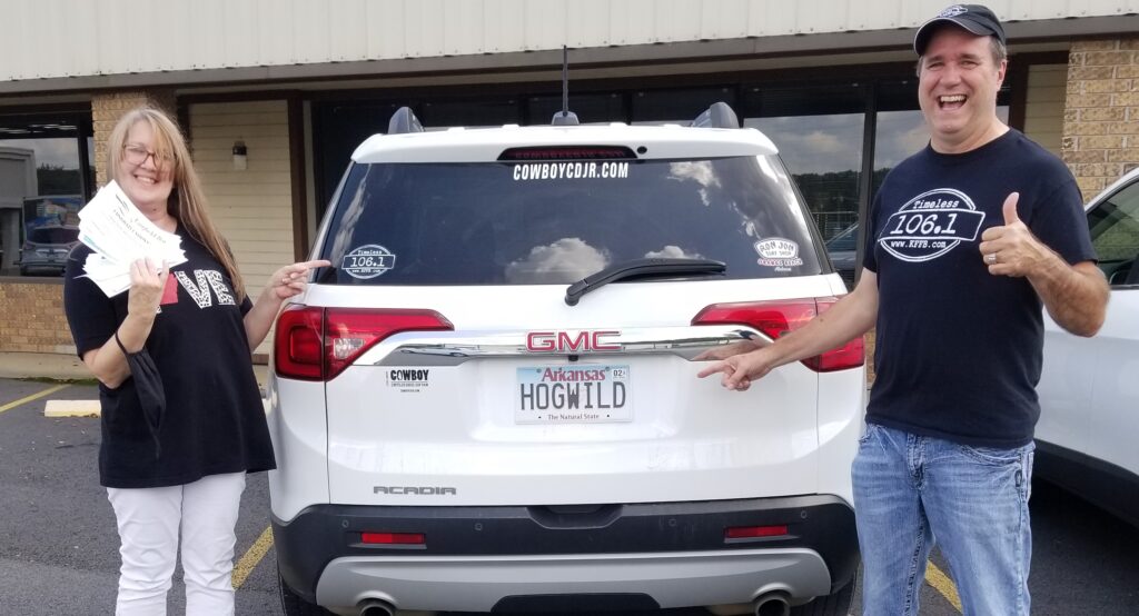 Congratulations to Sheila Pearson from Clinton, our second winner of the Timeless 106.1 KFFB Window Sticker Treasure Chest Giveaway, she picked up over $800.00, you gotta lover heer license plate # HOG WILD! Kathleen Kersting of Heber Springs was our first winner!
