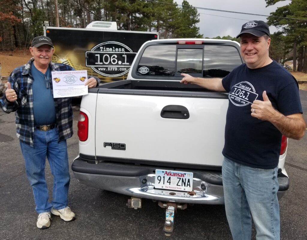Then text a picture of your window sticker on your vehicle with license plate number legible for correct identification to 501-362-5863 or email to bob@kffb.com or wait for our window sticker spotters to spot your sticker! If we don’t have a winner in 10 minutes and 31 seconds the prizes will transfer to the next day! Everyone is Eligible! Enter today! Will start reading out License plate numbers again in January after the Holidays! Merry Christmas and Happy New Year from Timeless 106.1 KFFB.