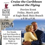 The Summit 55 Club of Eagle Bank (formerly Heber Springs State Bank) and KFFB 106.1 will cruise the Caribbean this November without the hassle of flying to the ships departure point.  A preview party to present all the details will be today, March 30th, from 2 p.m. Till 4 p.m. at Eagle Bank on … [Read more...]