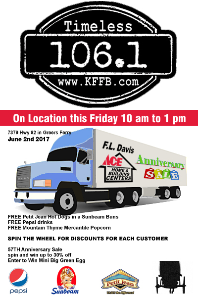 Join Timeless 106.1 KFFB Broadcasting Live Friday 10a-1p at F.L. Davis in Greers Ferry! Bob Connell owner of Timeless 106.1 KFFB and Renae Davis Estes owner of F.L. Davis in Greers Ferry invites you out for Free Petit Jean Hot Dogs, wrapped in a Sunbeam Bun, Pepsi, and Mountain Tyme Mercantile Popcorn and lots of prizes and spin the wheel for savings up to 30%!