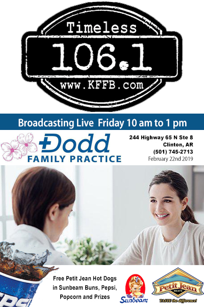 Join Timeless 106.1 KFFB broadcasting live from the Dodd Family Practice on 933 US-65 in Clinton, this Friday starting at 10 a.m. We’ll be serving up Free Petit Jean Hot Dogs, wrapped in a Sunbeam Bun, Pepsi and popcorn and Prizes too, with Timeless 106.1 KFFB. Register for lots of prizes and Timeless T-shirts to be giving away during the broadcast.
