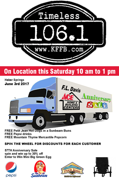 Join Timeless 106.1 KFFB Broadcasting Live Saturday 10a-1p at F.L. Davis in Heber Springs! Bob Connell owner of Timeless 106.1 KFFB and Renae Davis Estes owner of F.L. Davis in Greers Ferry invites you out for Free Petit Jean Hot Dogs, wrapped in a Sunbeam Bun, Pepsi, and Mountain Tyme Mercantile Popcorn and lots of prizes and spin the wheel for savings up to 30%!