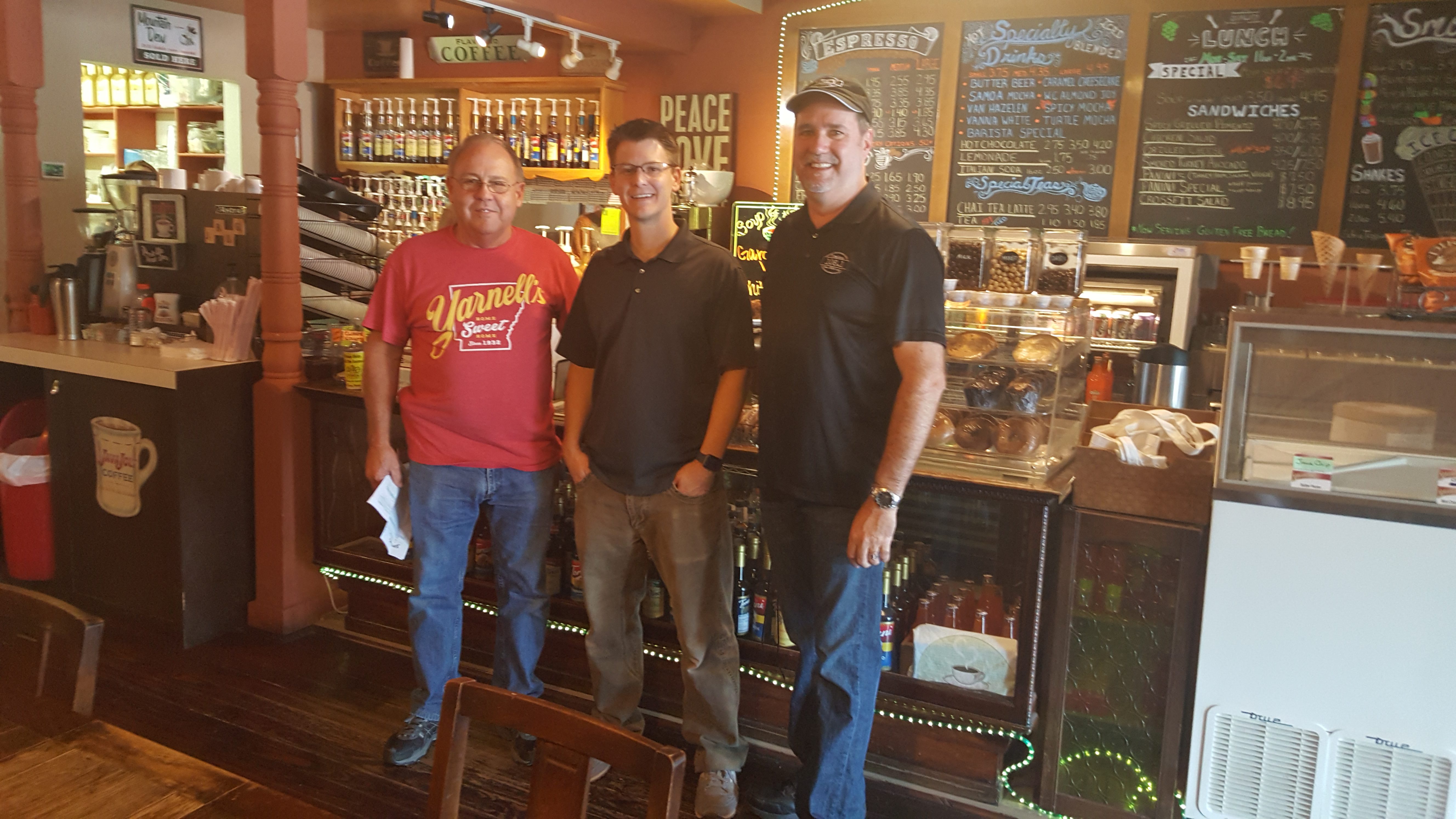 Yarnell’s Representative with, Scott with Jitterbug Coffee House and Timeless 106.1 KFFB’S Bob Connell, take timeout for a picture.