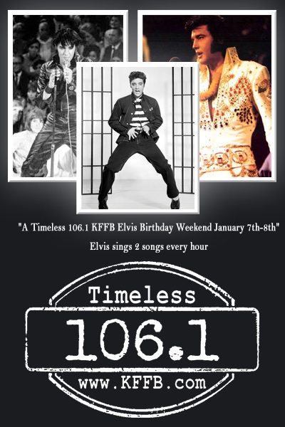 Timeless 106.1 KFFB will be highlighting the career of Elvis Presley on his Birthday Weekend. “Since we are the only station around that plays more than a handful of Presley’s songs, we will be doing an “Elvis Tribute Weekend,” explained Bob Connell Owner and General Manager of KFFB 106.1. Timeless 106.1 KFFB will feature two Elvis songs every hour from Saturday, January 7th through Sunday, January 8th (Elvis Birthday). The mix of songs will include the hits, major “B-sides”, movie tracks, live performances, and cover versions of other artist’s hits. The Elvis songs will all be introduced by “Elvis Weekend” fanfares.