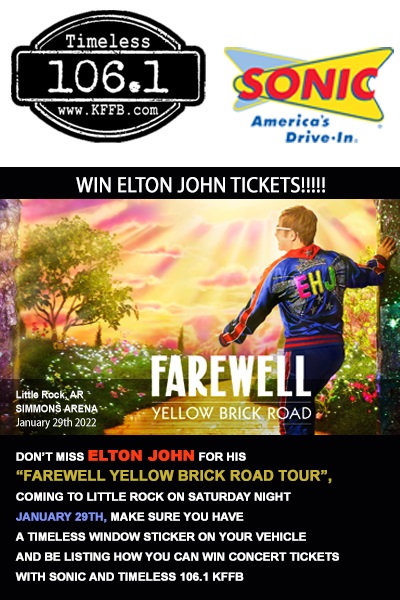 Timeless 106.1 KFFB & Sonic Welcomes Legend Elton John for his “Farewell Yellow Brick Road Tour”, on Saturday Night January 29th in Little Rock, be our guest with two tickets to the concert, we’ll be picking 10 Semi-Finalist with a Timeless 106.1 KFFB Window Sticker on their vehicle during our live broadcast. Each finalist will win a $10.00 Sonic Gift Card and will be entered for a chance to win two tickets to Elton John’s final Arkansas Concert,